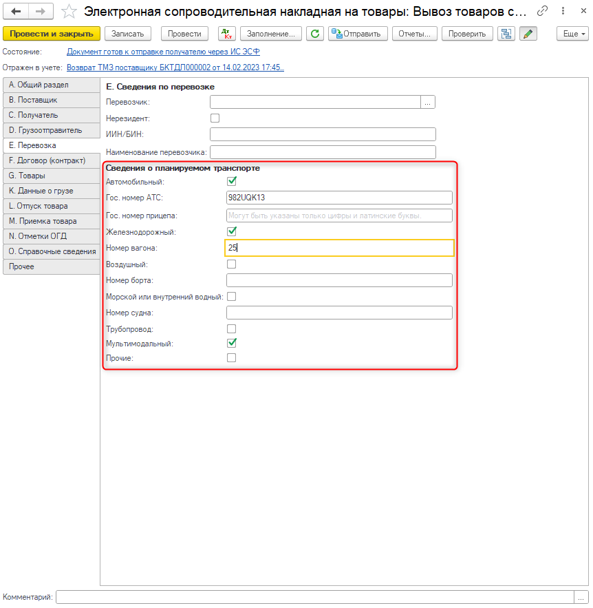 Перед отправкой СНТ на возврат необходимо заполнить данные о транспорте в разделе «Е. Перевозка». В случае если возврат осуществляется несколькими видами транспорта, в разделе Е необходимо установить признак «Мультимодальный» и заполнить всю информацию по тем видам транспорта, которыми фактически осуществляется возврат товара поставщику. Заполнение данного раздела является необходимым условием для отправки документа.