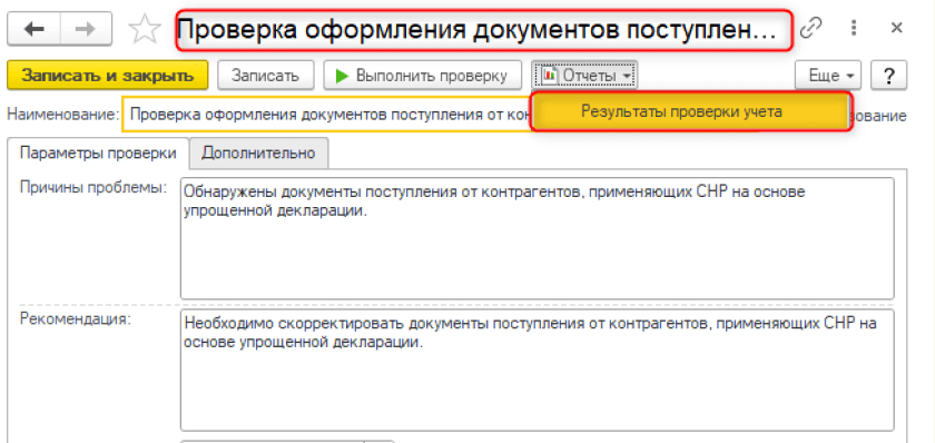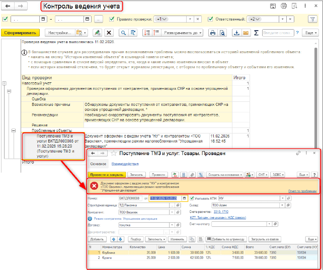 В конфигурацию добавлено новое правило проверки учета Проверка оформления документов поступления от контрагентов, применяющих СНР на основе упрощенной декларации. Проверка предназначена для выявления документов с видом учета НУ по налоговому учету, начиная с 01.01.2026 г., в которых выбран контрагент, применяющий режим налогообложения Упрощенная декларация.