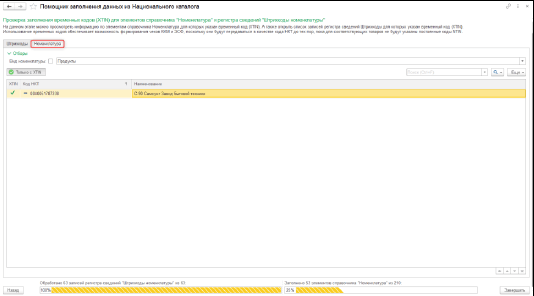 Вкладка Номенклатура — отображает элементы справочника Номенклатура, для которых в информационной базе ранее был указан временный код XTIN. В списке выводятся код НКТ и наименование номенклатуры.